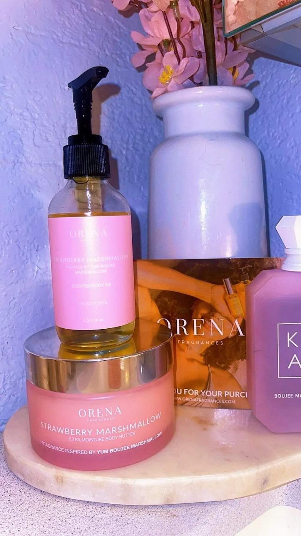 Strawberry Marshmallow by Orena Fragrances is a sweet little dream 🍓✨ The body butter is creamy, the oil is silky, and the scent is pure strawberry-marshmallow goodness. I’ve been pairing it with Yum Bougie and it’s magic, but honestly… no layering required.